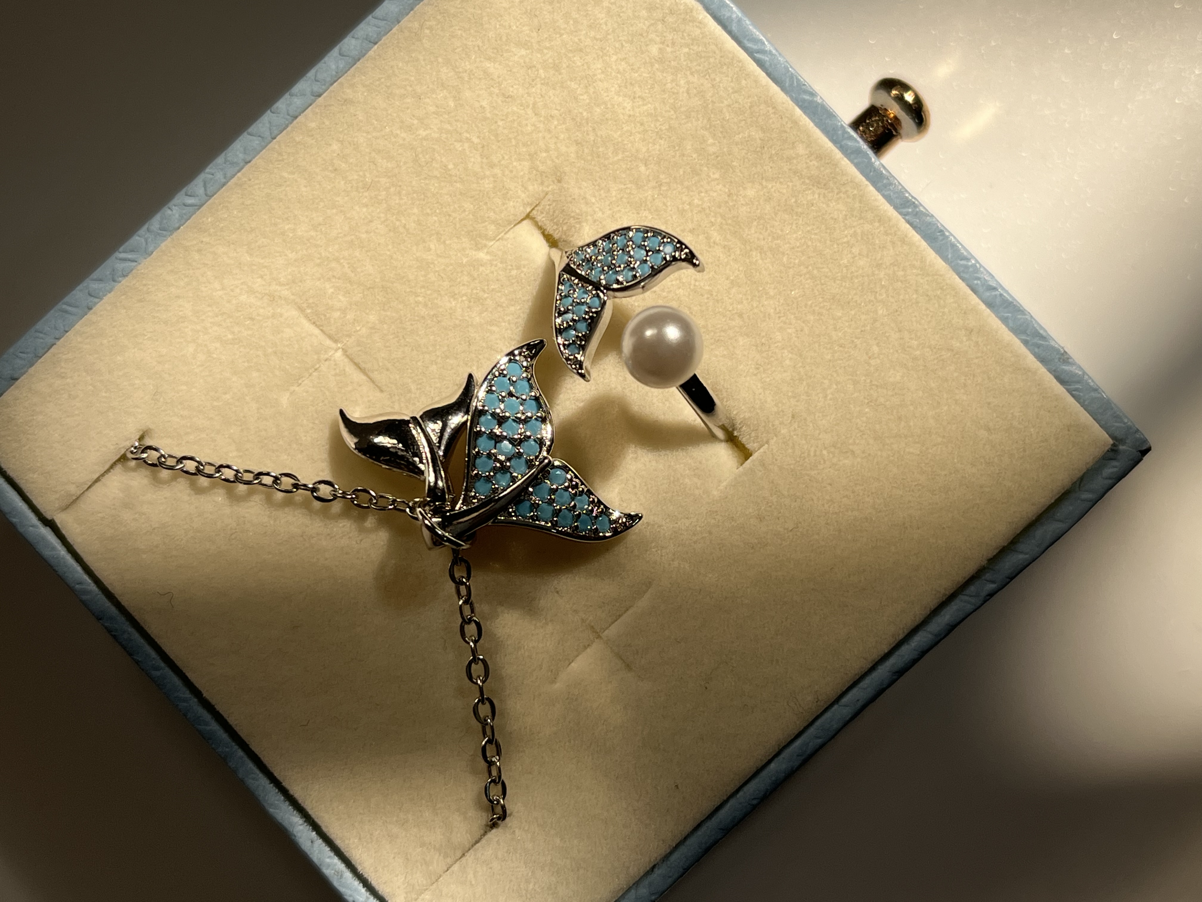 ست گردنبند و انگشتر دم وال فیروزه ای